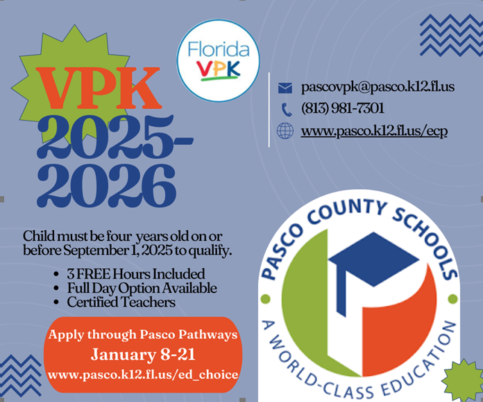 Attention parent looking for VPK for the 2025-2026 school year! Our school will have VPK slots available!! Apply for VPK for the 2025-2026 school year January 8-21 through the Pasco Pathways link: www.pasco.k12.fl.us/ed_choice. Two options with certified teachers are available: Part-time (3 VPK Free Hours) or Full Day (fee included). For more information about enrollment visit our website, www.pasco.k12.fl.us/ecp. For questions call (813) 981-7301 or email pascovpk@pasco.k12.fl.us.