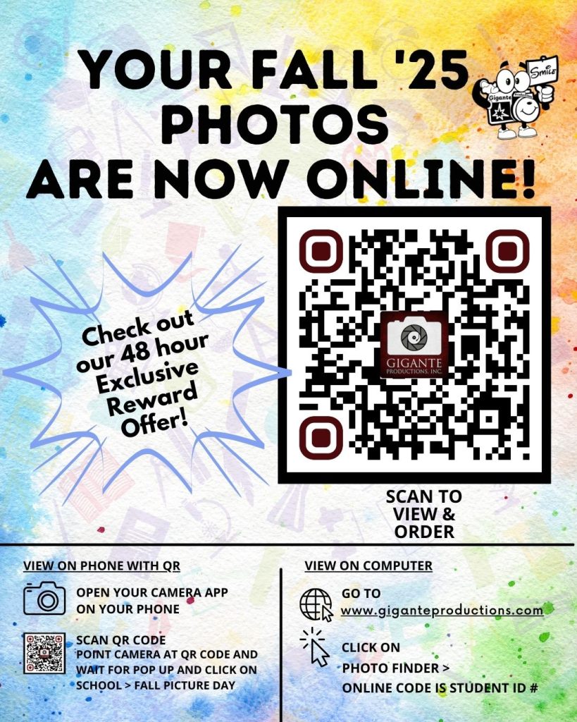 Your Fall ’25 Photos are now online. Scan QR code to view and order, or go to www.giganteproductions.com. Click on Photo Finder > Online Code is Student ID#.